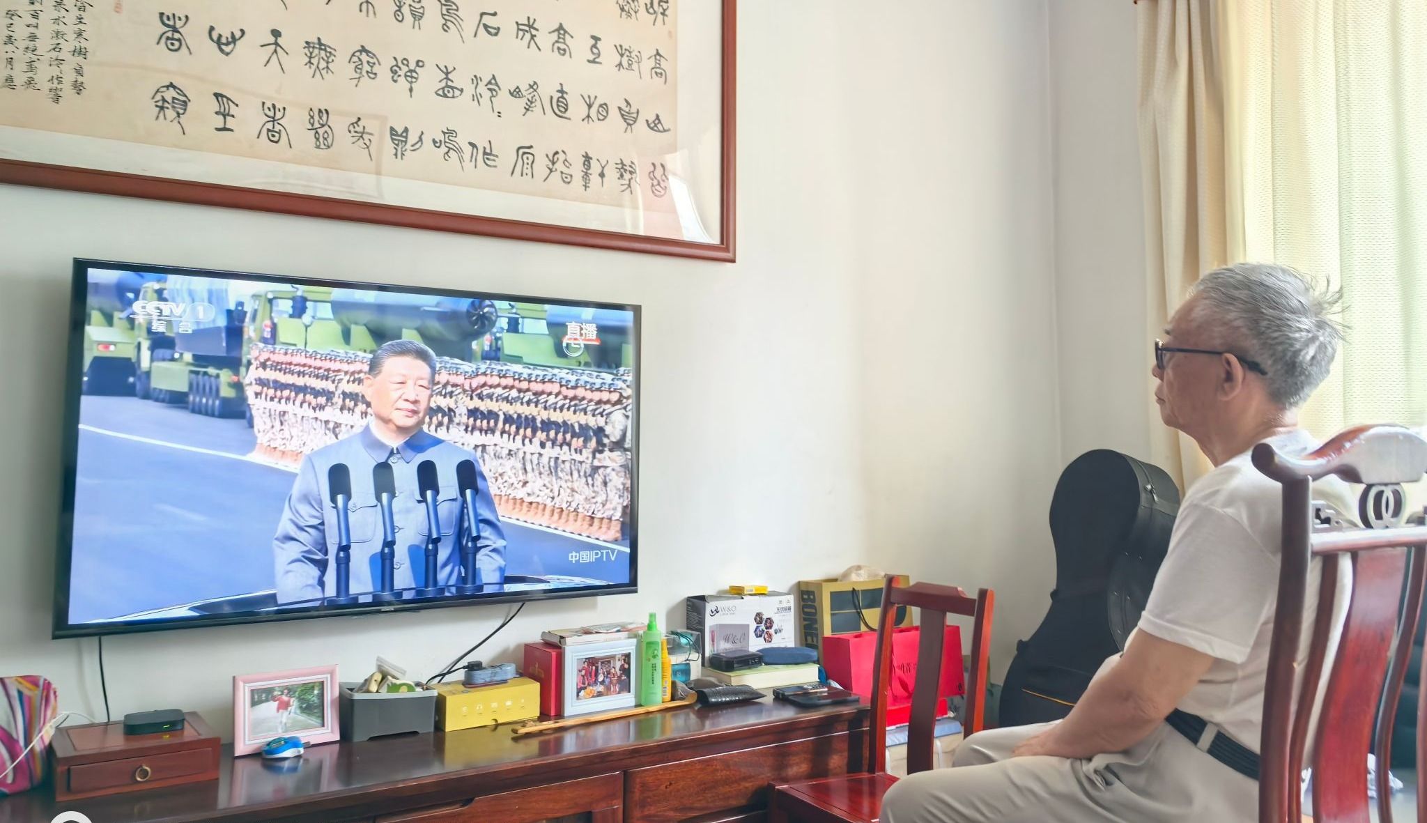 同样心系大会的还有陈大宣老师,他因病住院,但仍坚持在病房中观看直播。他说:“中国军队是不可战胜的钢铁长城,看到国家如此强大,我感到无比自豪和欣慰。”