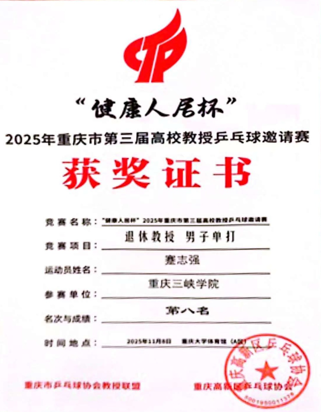 我校高教老协分会在“2025年重庆市第三届高校教授乒乓球邀请赛” 中表现优异,离退休教职工参赛选手在离退休组男子单打项目中斩获佳绩,分别获得第八名(明年自动入选种子选手)和第十二名的良好成绩。
